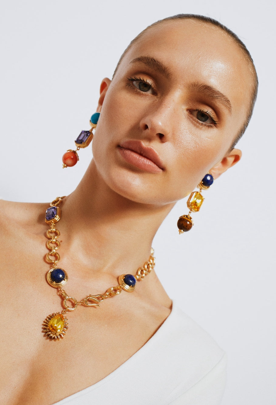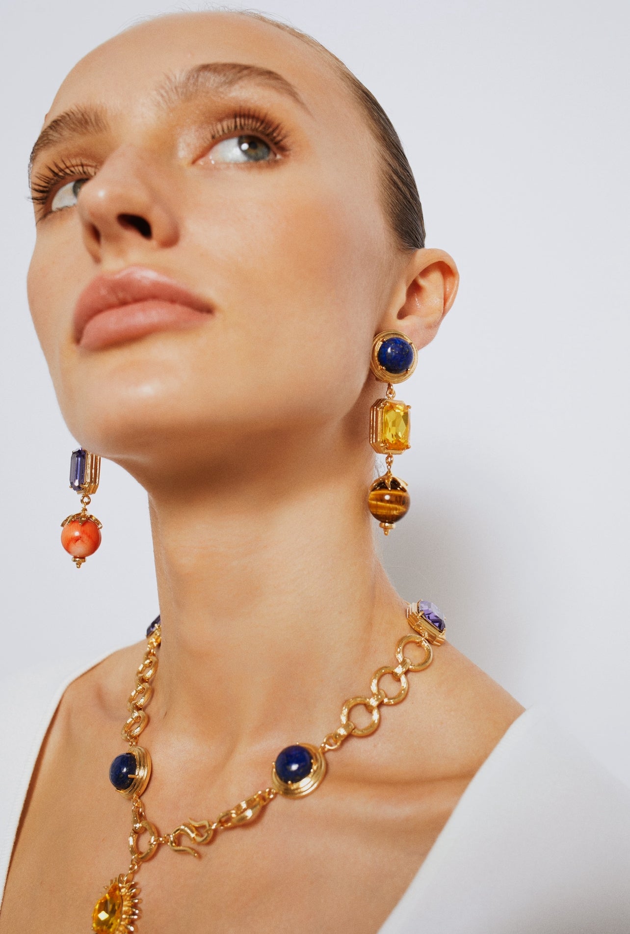 Flora Coral Tigereye Lapis Turquoise & Crystal Earrings